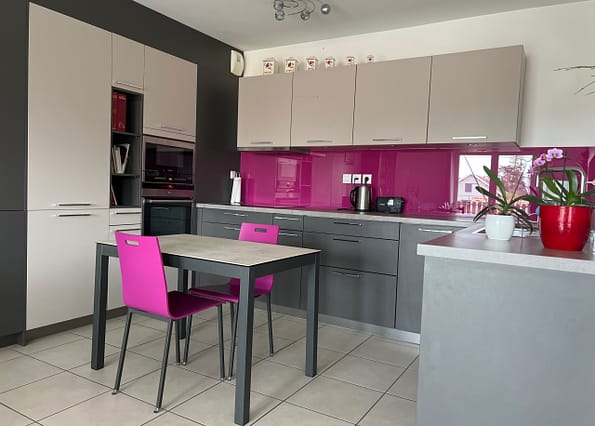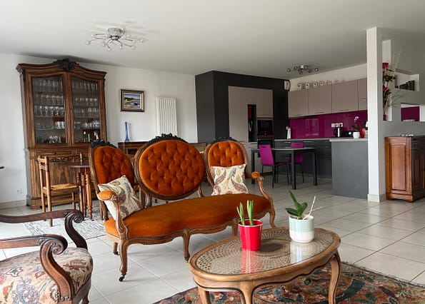 salon / séjour lumineux éclairé par deux grandes baies et une cuisine, ouverte, aménagée et équipée.